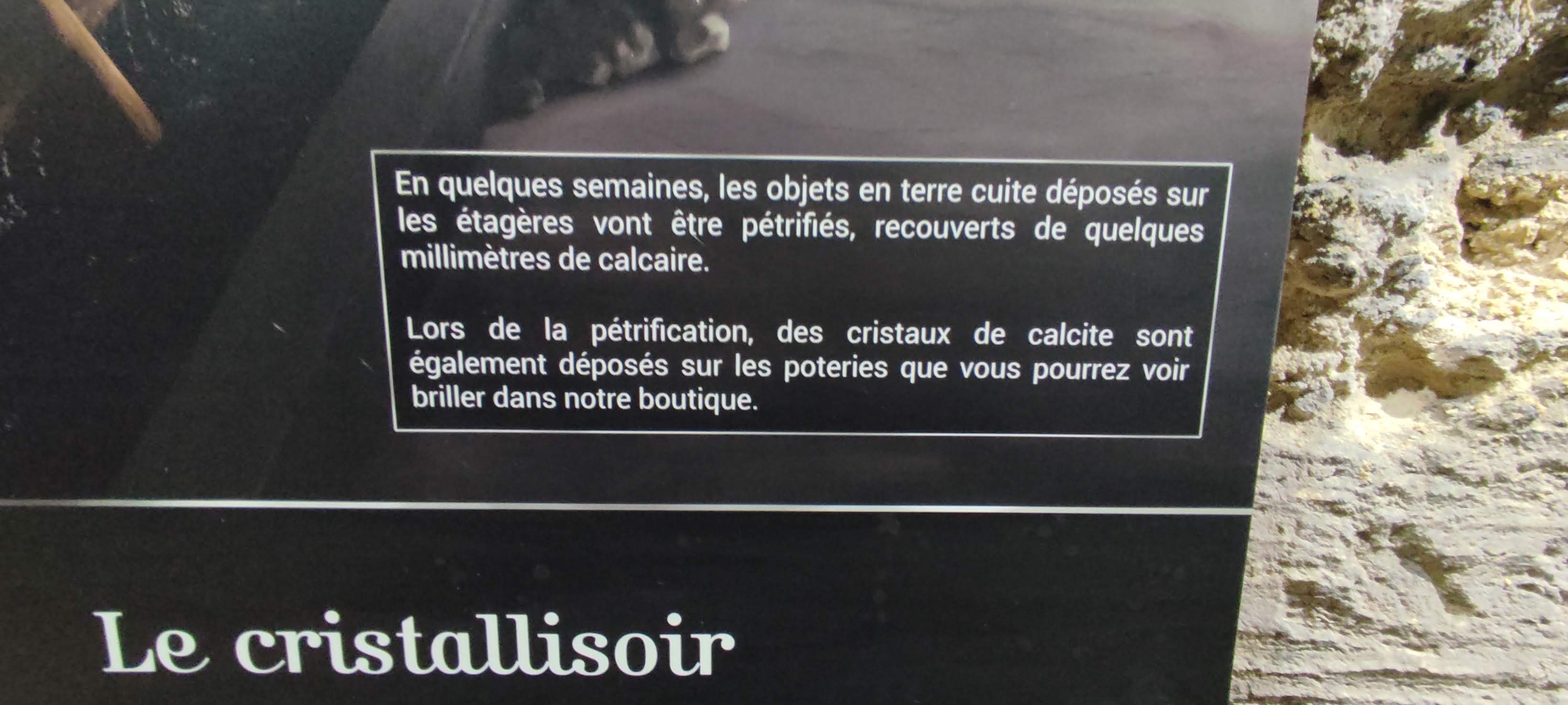 Très beau très reposant. Un endroit magique. Dommage qu il n y avait pratiquement plus d objets pétrifié à la boutique. On voulait absolument repartir avec un objets recouvert de calcite.... mais il ne restait presque plus rien... j imagine que le processus est très long, apparemment 3mois, mais c est dommage de ne pas mettre plus d'objet sous les fontaine ( il y avait plus d un tiers des places vide )
