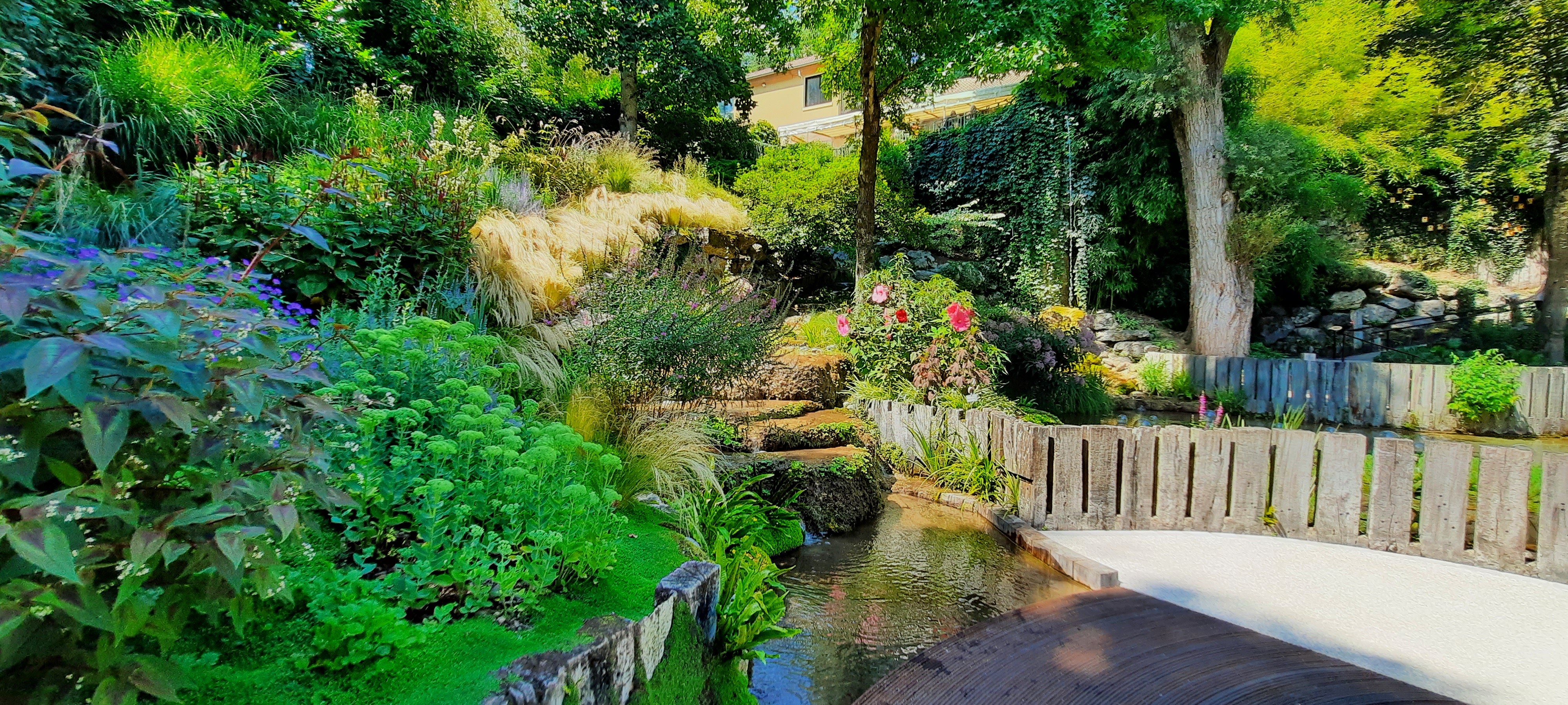 Jardin magnifique avec une cascade d'eau. Des plante et des fleurs sublimes. L'endroit est situé à côté d'une rivière. Il y a un système qui fait de la musique grâce à de l'eau.